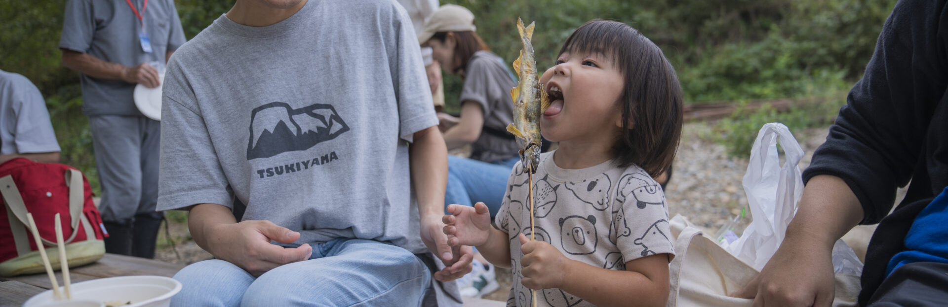 写真2(アユを頬張る子供):捕まえた直後に炭火で焼いたアユにかぶりつく参加者=島根県美郷町都賀西