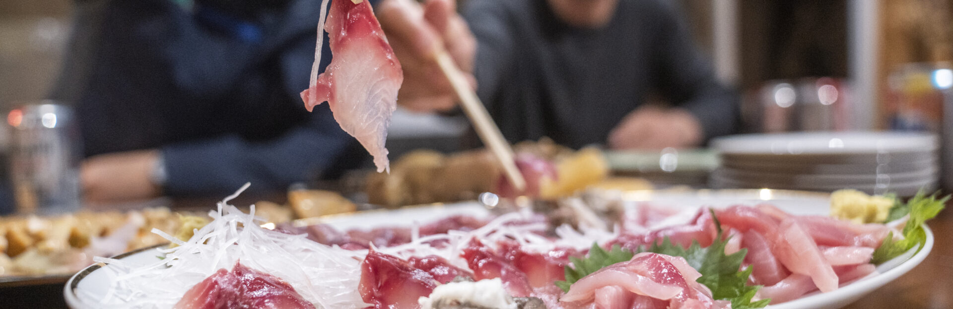 写真1:脂が乗ってコクのある鯉の刺身を楽しむお客さん=島根県邑南町下口羽、コイサイド