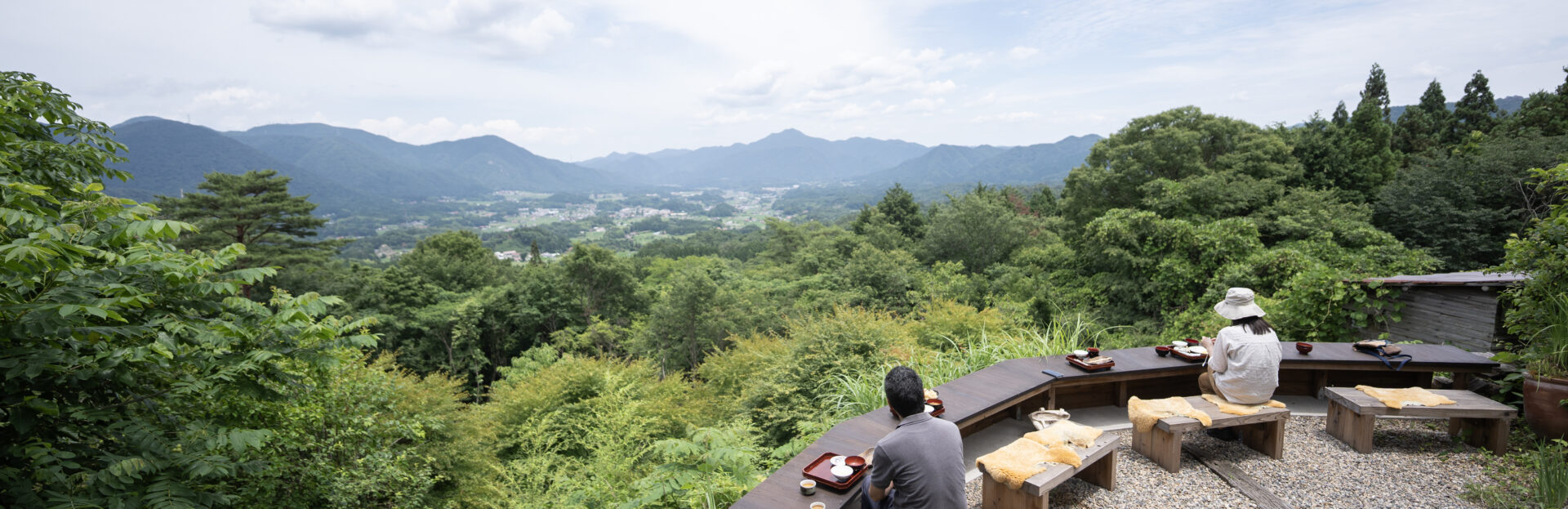 写真1:於保地盆地の絶景を見ながらランチバイキングを楽しむ来店者=島根県邑南町矢上(2024年6月撮影)