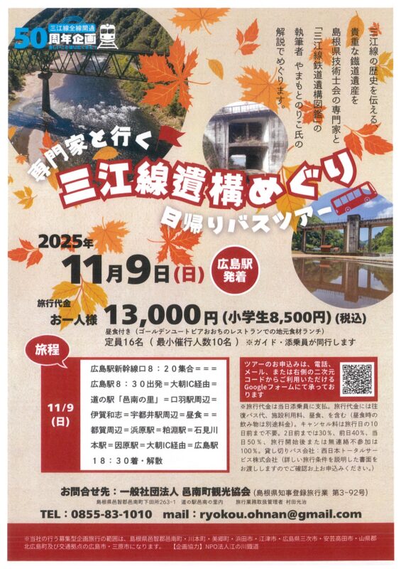 秋の風景に包まれながら🍂、三江線の面影をたどる貴重な一日をお楽しみください!