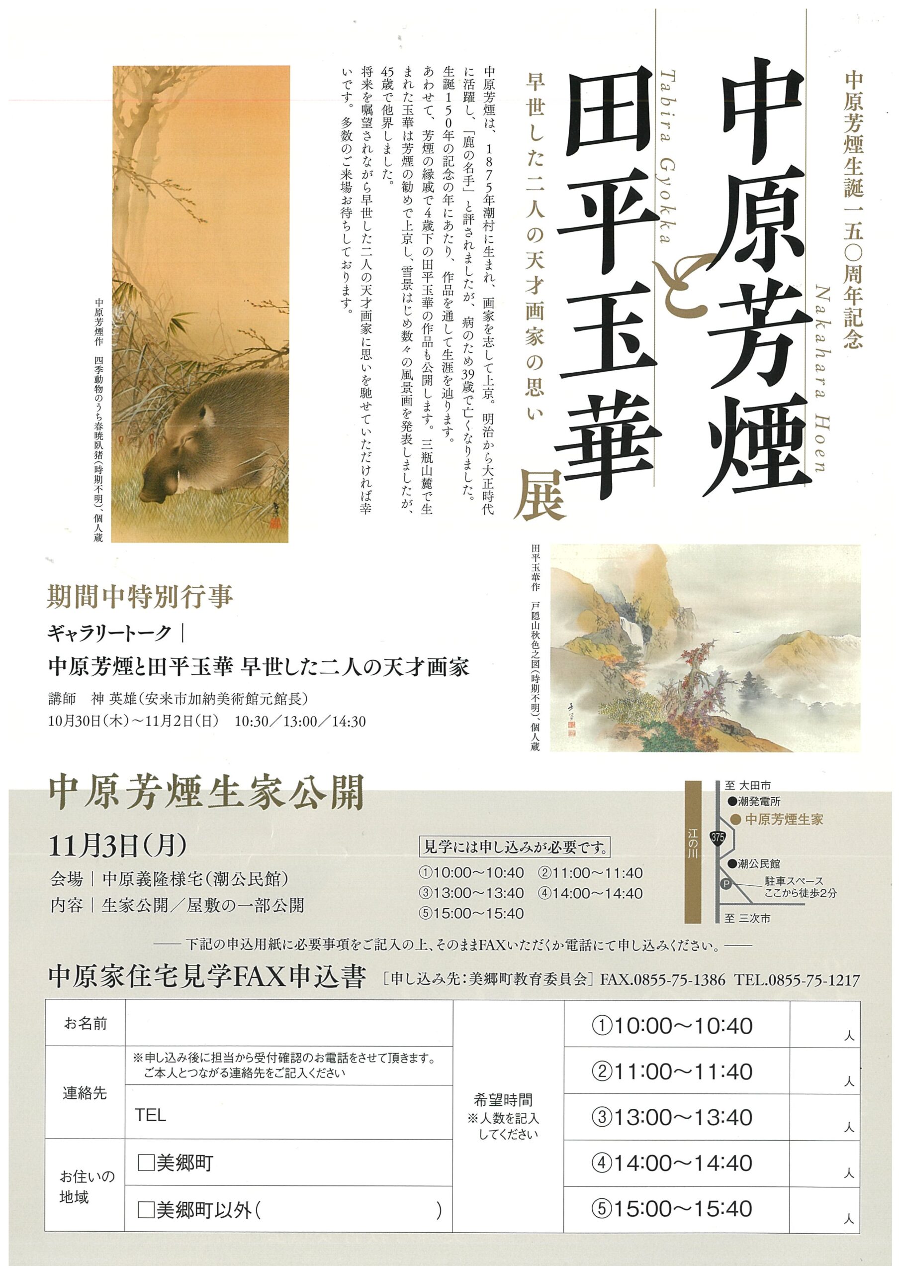 中原芳煙生誕150周年を記念し、作品の展示、元加納美術館館長 神 英雄氏によるギャラリートークがあります。
