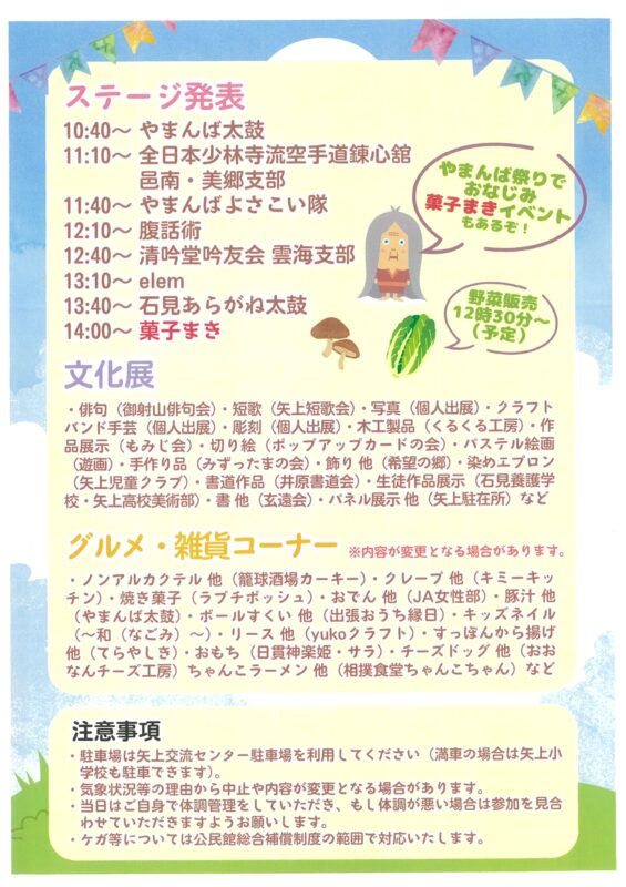 やまんば太鼓・空手演武・腹話術・菓子まきなど楽しいプログラムが続きます!