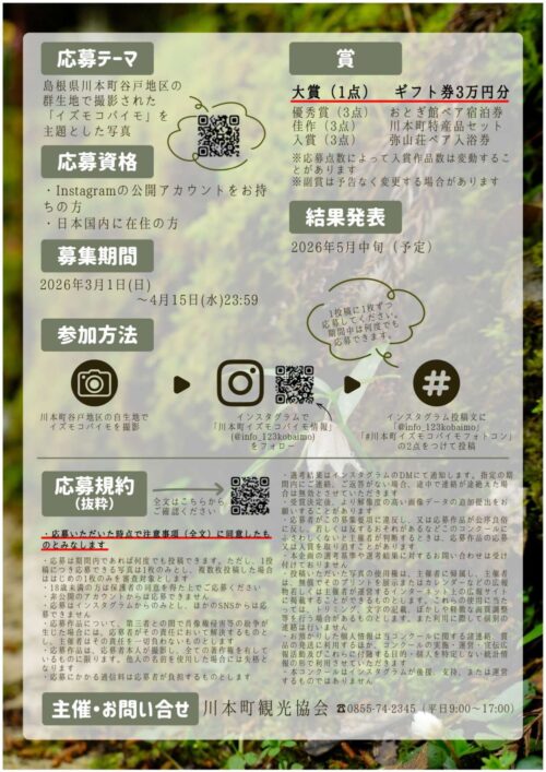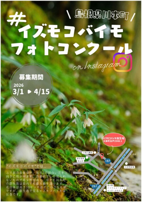 ニュース川本 2026.01.16 【川本町】「イズモコバイモフォトコンクール on Instagram」開催のお知らせ📷 川本町のイズモコバイモを撮影してフォトコンクールに応募しよう! Instagramを使ったフォトコンクールを開催します。 詳しくはリンク先をご確認ください。