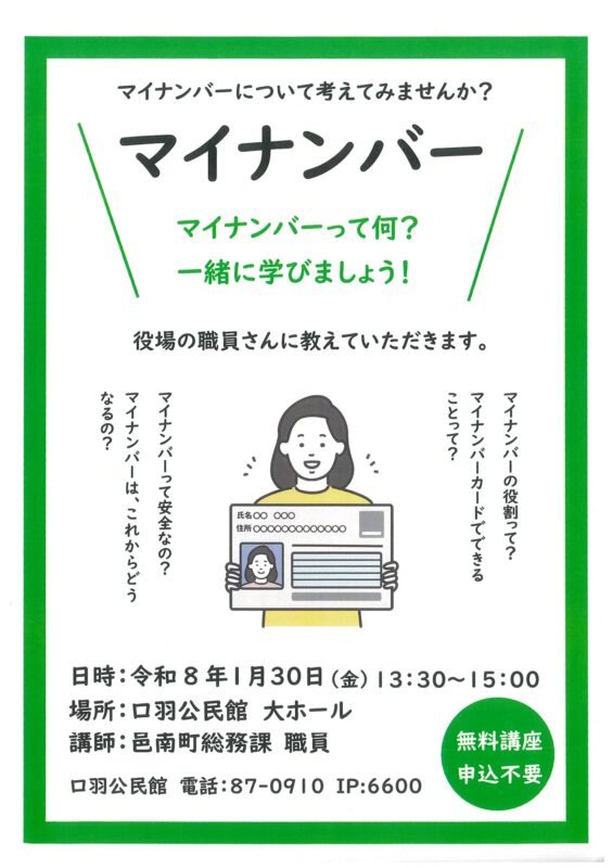 ニュース邑南 2026.01.28 【邑南町(おおなんちょう)】マイナンバーについて考えてみませんか⁇ マイナンバーって何❓ 📅日時:2026年1月30日(金)13:30~15:00 📍場所:口羽公民館 大ホール(邑南町下口羽484-1) 🧑🏻🏫講師:邑南町総務課 職員 ※無料講座・申込不要 【お問い合わせ】口羽公民館 87-0910