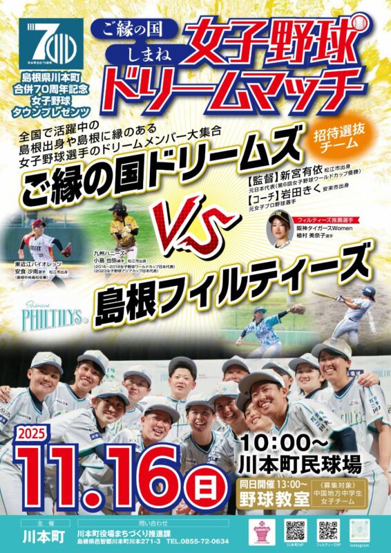 川本 2025.10.30 【川本町】女子野球ドリームマッチ⚾ 川本町合併70周年を記念して、町内の女子社会人野球チーム「島根フィルティーズ」と、島根県出身者やゆかりのある選手で構成された選抜チーム「ご縁の国ドリームズ」が対戦します。 今回限りの夢の対戦をぜひ現地でご覧ください! 日時:2025年11月16日(日) 10:00~ 場所:川本町民球場(川本町大字川下(川本公園内)) お問合せ:川本町役場 まちづくり推進課(☎0855-72-0634)
